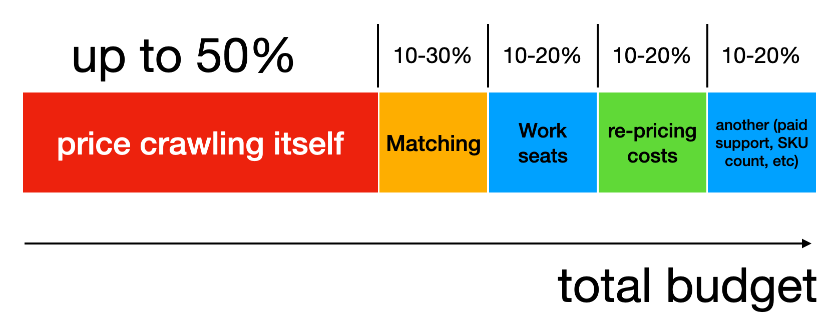 Meanwhile, the biggest share of budget in price monitoring configurations usually allocated into crawling data inself. Here's how cost share of full annual budget looks like in terms of subservices in most cases: