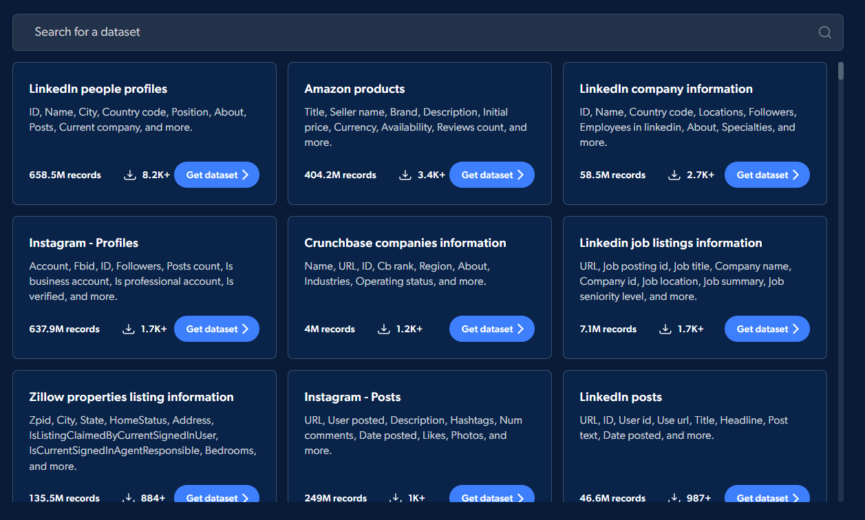 For developers, Bright Data offers the Web Scraper IDE, a cloud-based development environment for building custom scrapers. The platform includes pre-built templates for popular websites and a library of JavaScript functions for common scraping tasks. Their SERP API extracts structured data from search engines, and the Dataset Marketplace provides pre-collected data from over 120 popular domains.