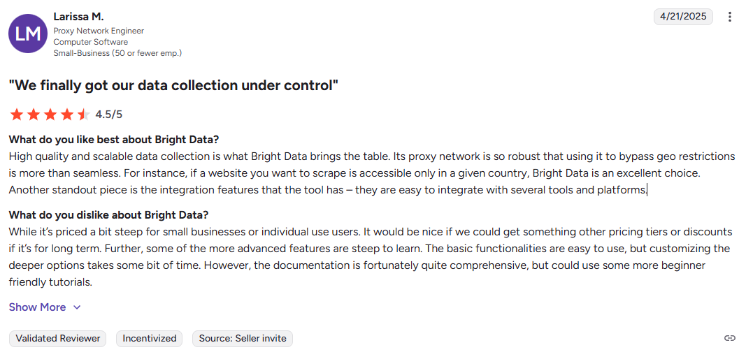 Bright Data's technical profile: Using Bright Data effectively requires developers comfortable with API integration and JavaScript or Python scripting. The Web Scraper IDE uses JavaScript, and the platform's extensive features (session management, proxy rotation rules, geo-targeting parameters) require technical expertise to configure optimally. The company provides 24/7 support and comprehensive documentation, but the learning curve remains substantial.
