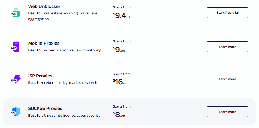 The platform offers over 100 million residential IPs across 195 countries, with mobile and datacenter options available. Like Bright Data, Oxylabs provides Web Unblocker technology for bypassing anti-bot systems, with the company claiming high success rates.