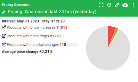 The Pricing Dashboard provides an at-a-glance view of key metrics through customizable widgets. Users can create widgets for pricing dynamics (price increases, drops, no changes), stock dynamics, pricing landscape (cheapest vs. most expensive positioning), and product history charts.